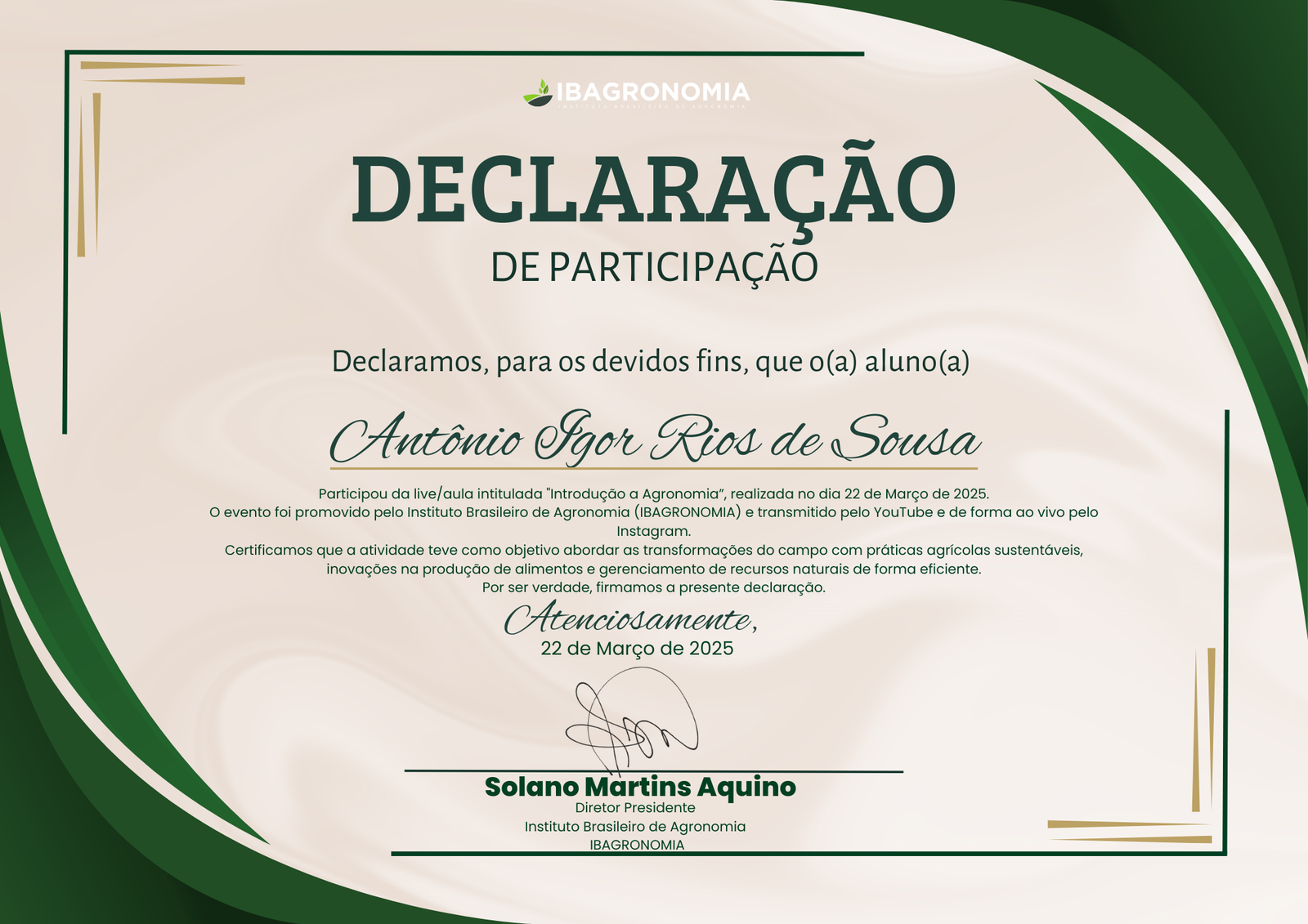Todos os participantes presentes na nossa AULA GRATUITA sobre AGRONOMIA receberão um Certificado Digital de Participação emitido pelo IBAGRONOMIA. Este certificado reconhece sua dedicação ao aprimoramento dos conhecimentos na área ambiental e é uma prova do seu compromisso com o desenvolvimento profissional em um setor estratégico para o futuro sustentável.